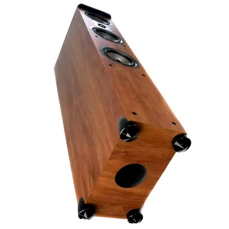 Сегодняшний объект нашего интереса — напольные АС TSi 400. Это двухполосные системы фазоинверторного типа, порт расположен на нижней стенке корпуса. В этой модели используются три низкочастотных излучателя со 135-миллиметровыми диффузорами из ламинированного стекловолокна. Они занимают почти всю ширину передней панели, что минимизирует дифракцию. Традиционно для акустических систем Polk Audio у твитера дюймовый шелковый купол со специальным полимерным антирезонансным покрытием (технология Dynamic Balance).