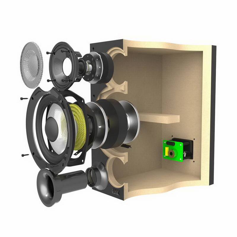 Акустическая система ELAC Debut B5.2 имеет двухполосную конфигурацию, при этом оба установленных в них динамика были обновлены. Низкочастотник получил новый диффузор из армированного волокна и мощную магнитную систему, что позволило повысить его отдачу в диапазоне рабочих частот и дополнительно снизить искажения. Басовик смонтирован на литой корзине, которая обладает превосходными антирезонансными свойствами. ELAC Debut B5.2 имеет новый твиттер, который работает в расширенном диапазоне частот и обладает прозрачным и детализированным звуком. Высокочастотник оснащен крупным магнитом и нагружен на круглый рупор-звуковод. Все это обеспечило твитеру высокую чувствительность и сделало его звучание детализированным и прозрачным. Динамики подключены к разделительному фильтру, который изготовлен с использованием отборных компонентов и обладает минимальными фазо-частотными искажениями. Для подключения к усилителю служит пара позолоченных винтовых клемм.