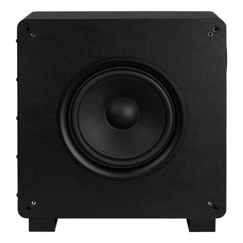 ELAC Muro Sub2010 оснащен низкочастотным динамиком диаметром 8 дюймов с диффузором из пропитанной бумаги и мощной магнитной системой. Этот излучатель находится на боковой стенке корпуса сабвуфера, полностью закрытой металлической защитной сеткой. Басовик акустически нагружен на фазоинвертор, выходное отверстие которого выведено на фронтальную панель корпуса. Благодаря этому ELAC Muro Sub2010 можно размещать в углу или вплотную к стене, без искажения частотной характеристики. В сабвуфере установлен усилитель с номинальной мощностью 125 Вт, выполненный по схемотехнике BASH. Для подключения к источнику сигнала в ELAC Muro Sub2010 предусмотрены линейные стереовходы и вход LFE, но в данной модели имеется и возможность беспроводного подключения.