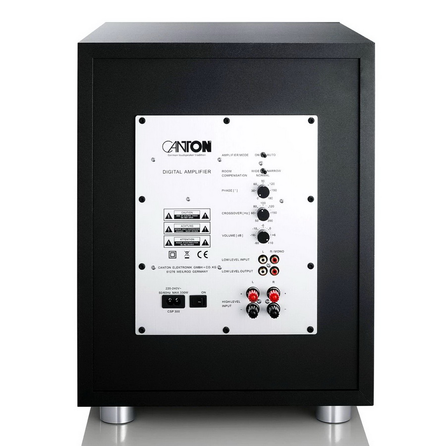 Сетевой кабель снимается, режим работы отображает светодиодный индикатор на фасадной части корпуса. Canton Power Sub 8 оборудован разъёмами низкого и высокого уровня, что открывает широкие возможности для подсоединения к различным устройствам, например, предусилителю, активным колонкам и даже другому сабвуферу для создания мощной звуковой системы.