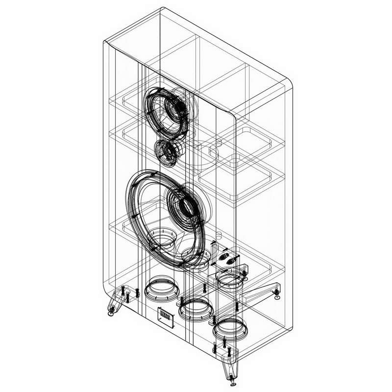 Акустическое оформление то же, что у двухполосных «Директов»: из отдельной внутренней камеры фазоинверторы выведены в сторону пола. Разница лишь в том, что здесь не два, а три «ствола». Причем диаметр всех скругленных портов настолько внушителен, что сквозь образовавшиеся раструбы нетрудно разглядеть все внутренние усилительные распорки, элементы фильтров, мощную проводку и звукопоглотители (если, конечно, вам не лень ради этого заваливать на бок гигантские ящики). Масса каждой колонки также внушает: почти 70 килограммов, и львиная их доля приходится на плиты MDF. Особенно хорошо задемпфирована изящно закругленный по краям лицевой щит.