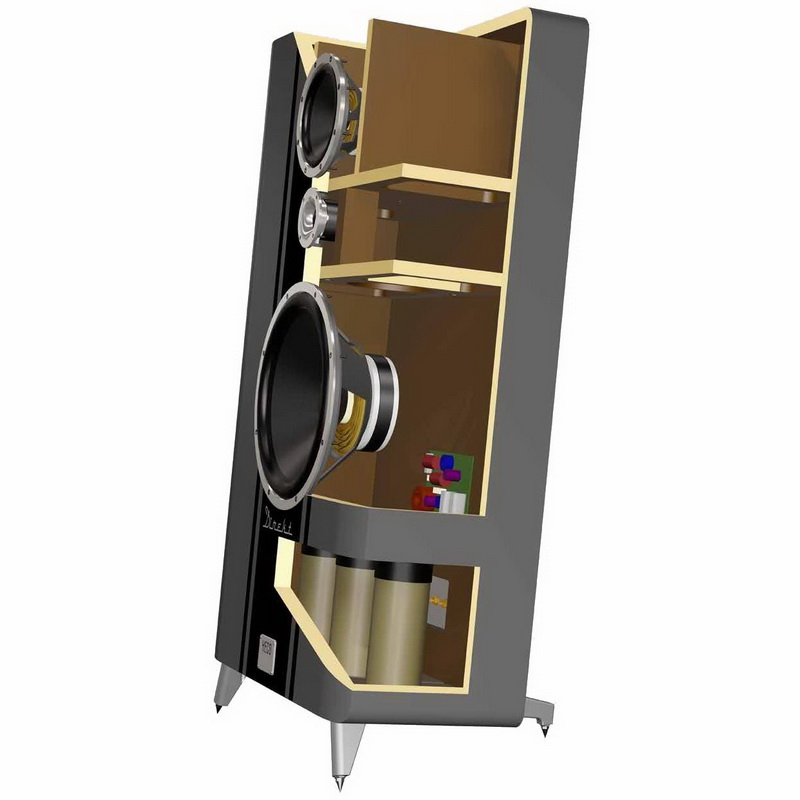 Удачный опыт по выводу «неформатных» двухполосных напольных мониторов Direkt компания Heco решила закрепить выпуском еще более внушительной трехполосной акустики Direkt Dreiklang, выполненной в том же запоминающемся стиле – с винтажными пропорциями, подчеркнуто высокими ножками и характерным наклоном назад. Выглядят системы, окрашенные полуматовой темной эмалью и декорированные вертикальными полосами, надо признать, ошеломляюще. Не зря к разработке новой модели привлекли известного в Германии промышленного дизайнера Хельмута Тиля.