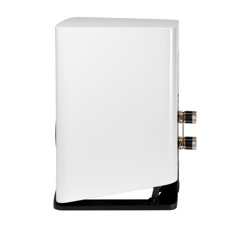 Корпус у Carina в принципе задуман неровным: задняя стенка мало того, что короче фронтальной, так еще и уже. Все ради избавления от стоячих волн и нежелательных резонансов. Стенки, судя по всему, разной толщины: если по ним постучать, бока звучат не так, как фронтальная или задняя панели. Акустика доступна в сатиновой черной или белой отделке — и белая на черной подставке выглядит даже несколько биомеханически. Защитные сетки в конструкции в принципе не предусмотрены — ни магнитные, ни какие-либо еще.