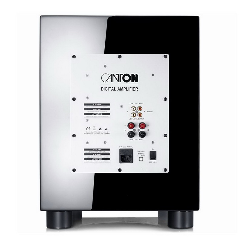 Сетевой кабель снимается, режим работы отображает светодиодный индикатор на фасадной части корпуса. Canton SUB 12 R оборудован разъёмами низкого и высокого уровня, что открывает широкие возможности для подсоединения к различным устройствам, например, предусилителю, активным колонкам и даже другому сабвуферу для создания мощной звуковой системы.