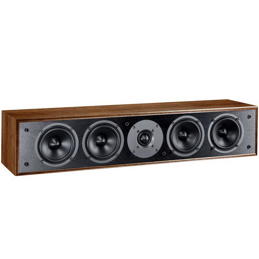 Колонка Magnat Monitor S14 C изготовлена в демпфированном корпусе из отборного MDF и имеет качественную внешнюю отделку текстурной виниловой пленкой. Она может быть двух видов – черной или под ореховое дерево. Черная фронтальная панель придаcт модели элегантный внешний вид в случае, когда защитная сетка будет снята. При значительной ширине колонка получилась невысокой, за счет чего не будет загромождать пространство под экраном. На фронтальной панели расположено четыре динамика диаметром 110 мм, по два с каждой стороны от твитера. Все они оснащены бумажными диффузорами. Крайняя пара динамиков работает на басах, в то время как находящиеся ближе к ВЧ-динамику «захватывают» еще и среднечастотный диапазон. Таким образом, звучание колонки получилось сбалансированным и точным, а его воспринимаемое качество остается высоким как для зрителей, сидящих по центру экрана, так и со смещением от него.
