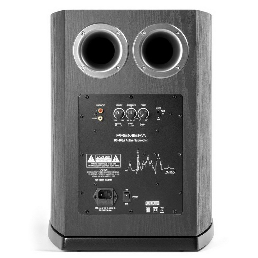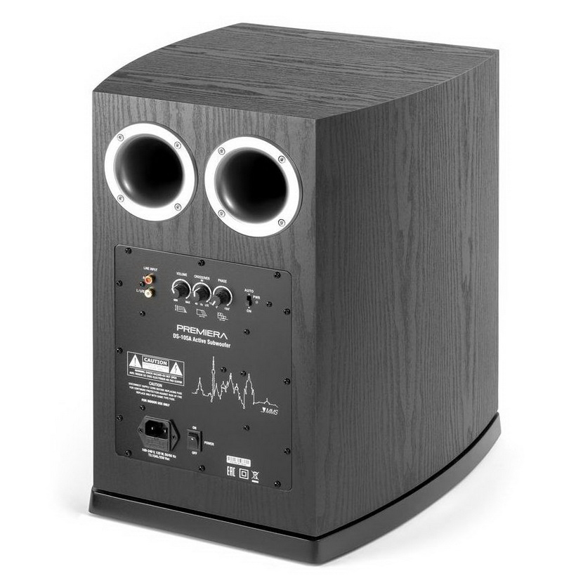 Активный сабвуфер Premiera Delta DS-10SA построен по классической схеме с двумя задними портами фазоинвертора. При более близком знакомстве можно обнаружить и другие фирменные решения. В первую очередь, это солидный (250 мм) низкочастотный драйвер, имеющий диффузор из усиленной целлюлозы и солидную магнитную систему, необычная форма корпуса со скругленными боковыми стенками и, наконец, встроенный усилитель с пиковой мощностью 200 Вт. На задней панели располагаются регулятор частоты среза (50 — 150 Гц) и уровня громкости. Странно, что производитель не предусмотрел изменение фазы — вещь весьма полезная при настройке системы. Подключение к ресиверу возможно как по входам высокого уровня, так и с помощью терминала LFE. Выход же имеется только с акустических клемм. Сам агрегат весьма массивен и обладает солидным весом, что говорит о серьезности принятых мер по демпфированию корпуса. Качество отделки и сборки всех элементов конструкции Premiera Delta DS-10SA высоко, оклейка поверхностей пленкой под дерево выполнена предельно аккуратно, без каких-либо швов или неровностей.