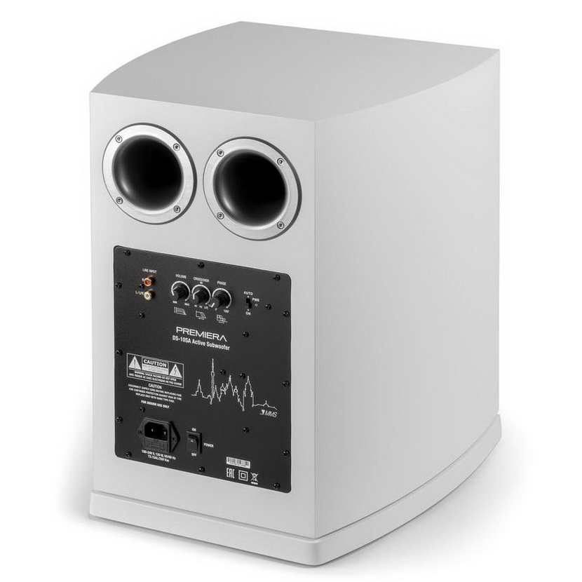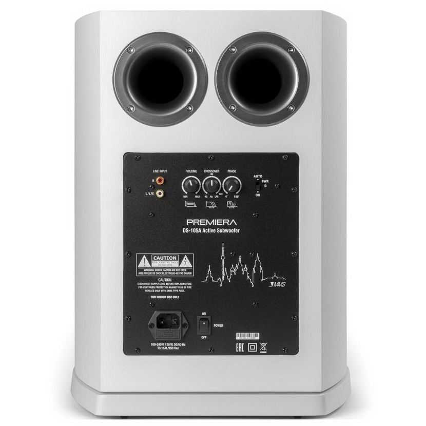 Активный сабвуфер Premiera Delta DS-10SA построен по классической схеме с двумя задними портами фазоинвертора. При более близком знакомстве можно обнаружить и другие фирменные решения. В первую очередь, это солидный (250 мм) низкочастотный драйвер, имеющий диффузор из усиленной целлюлозы и солидную магнитную систему, необычная форма корпуса со скругленными боковыми стенками и, наконец, встроенный усилитель с пиковой мощностью 200 Вт. На задней панели располагаются регулятор частоты среза (50 — 150 Гц) и уровня громкости. Странно, что производитель не предусмотрел изменение фазы — вещь весьма полезная при настройке системы. Подключение к ресиверу возможно как по входам высокого уровня, так и с помощью терминала LFE. Выход же имеется только с акустических клемм. Сам агрегат весьма массивен и обладает солидным весом, что говорит о серьезности принятых мер по демпфированию корпуса. Качество отделки и сборки всех элементов конструкции Premiera Delta DS-10SA высоко, оклейка поверхностей пленкой под дерево выполнена предельно аккуратно, без каких-либо швов или неровностей.