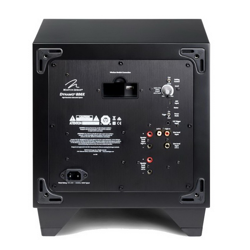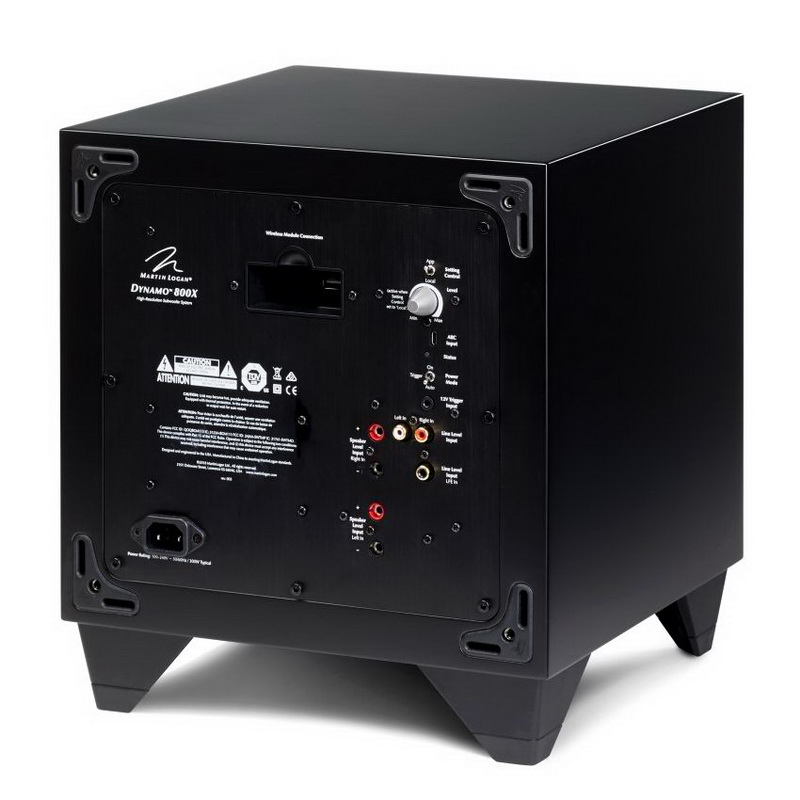 Для устранения проблем с проводкой сигнального кабеля система предусматривает установку опционального беспроводного входа SWT-X (продается отдельно). Он использует новейшие технологии беспроводной передачи звука, включая динамический выбор частоты 2,4 ГГц, прямое исправление ошибок и работу на расстоянии до 15 метров. Модель MartinLogan Dynamo 800X также имеет вход левого и правого канала RCA, вход для сигнала высокого уровня. Кроме того, MartinLogan Dynamo 800X получил входы RCA для подключения LFE. Левый и правый входы содержат дискретные, настраиваемые пользователем фильтры нижних частот, позволяющие использовать разные уровни и точки пересечения при воспроизведении двухканальной музыки. На борту MartinLogan Dynamo 800X также имеется триггерный вход 12 В, позволяющий внешнему устройству включать и выключать сабвуфер.