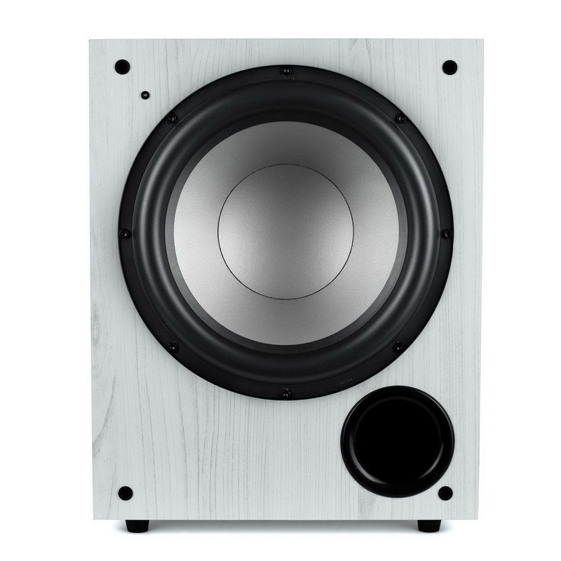 На первый взгляд, немалые габариты саба дают основания ожидать от него полноценную басовую поддержку. Эти ожидания поддерживает 12-дюймовый драйвер из полифибры с добавлением графита, обрамленный достаточно большим подвесом.Динамик и фазоинвертор саба почти полностью заняли его лицевую панель: динамик — в верхней ее части, фазоинвертор — в правом нижнем от слушателя углу.