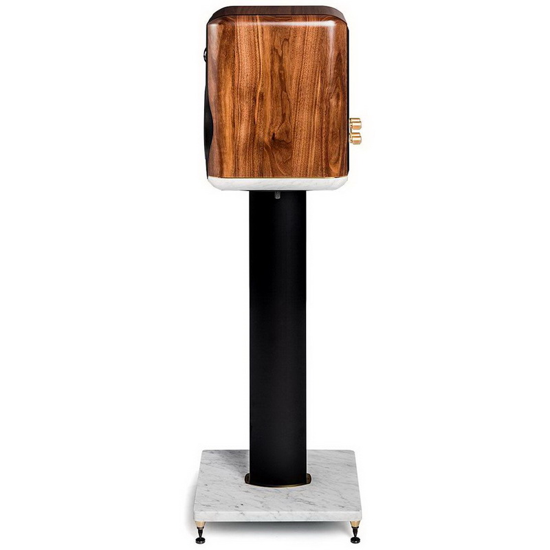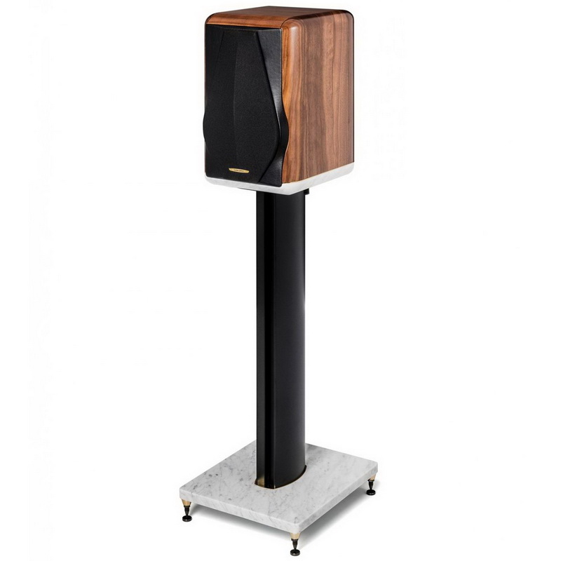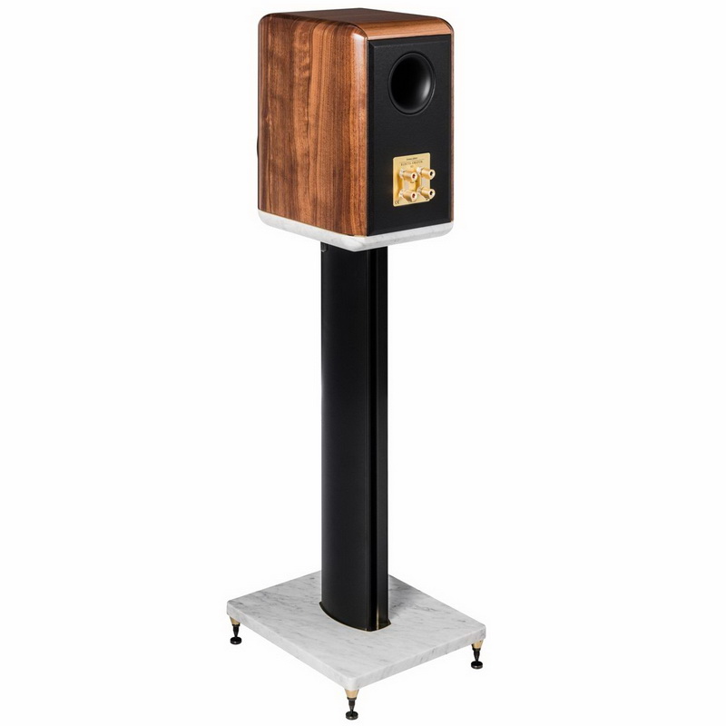 Стойки составляют единое целое с мониторами – мраморное основание корпуса двумя болтами крепится к установочной площадке. Двойная 70-сантиметровая колонна опирается на мраморную платформу размером 30 х 35 см, в которую через резьбовые втулки вкручиваются шипы. Общая масса конструкции получается более 25 кг. В целом же создатели мониторов хотели воссоздать тот винтажный саунд, присущий первым «Аматорам» — отсюда и форма корпуса, и выбор материала для диффузоров, и лаконичный фазолинейный фильтр.