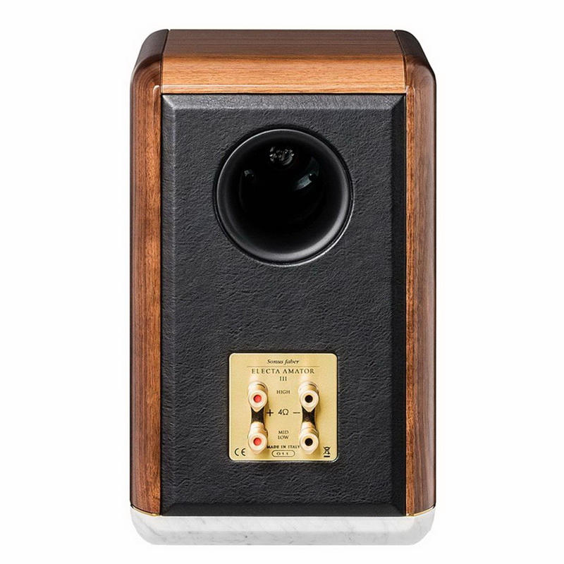 Sonus Faber Electa Amator III имеет эффектный и легко узнаваемый дизайн с округлыми углами и плавными гранями. Колонка обладает акустически инертным корпусом из цельного массива древесины (орех), который может похвастаться превосходным демпфированием. Нижняя панель корпуса изготовлена из каррарского мрамора и отделена от массива тонкой латунной прослойкой. Благодаря такому сочетанию различных материалов улучшаются антивибрационные свойства всей конструкции. Фасад и задняя часть получили стильную «лакшери»-отделку натуральной кожей, выполненную вручную опытными мастерами, а круглый порт фазоинвертора вынесен в тыл.