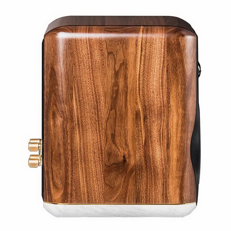 Полосы делятся фильтрами, построенными по собственной топологии Paracross topology, позволяющей получить слитное звучание за счёт точного временного согласования обоих излучателей. Схема с частотой раздела 2600 Гц собрана из полипропиленовых конденсаторов Clarity Cap ESA и катушек индуктивности Jantzen «на воздухе». Плата защищена от вибраций, сигнал от усилителя к фильтрам подаётся через четыре заказные клеммы, установленные на золотистой декоративной пластине с гравировкой. Тканевые грили тоже с изюминкой – их форма и чёткие выпуклые грани повторяют рельеф лицевой панели. Чувствуется, что дизайнеры поработали с фантазией.