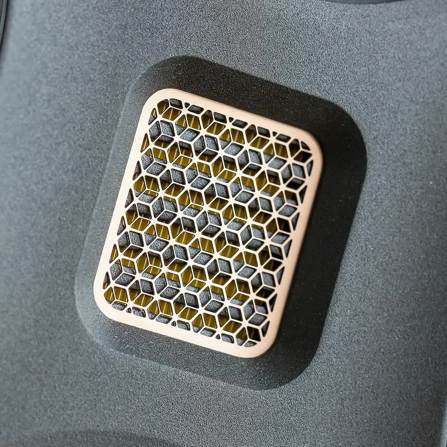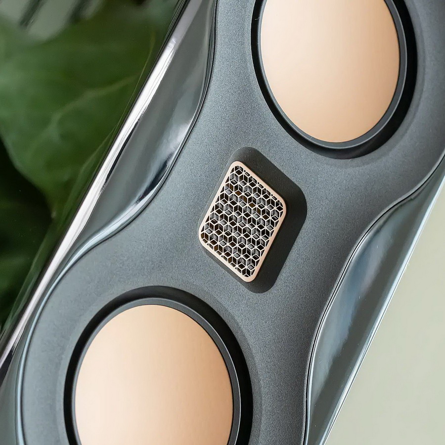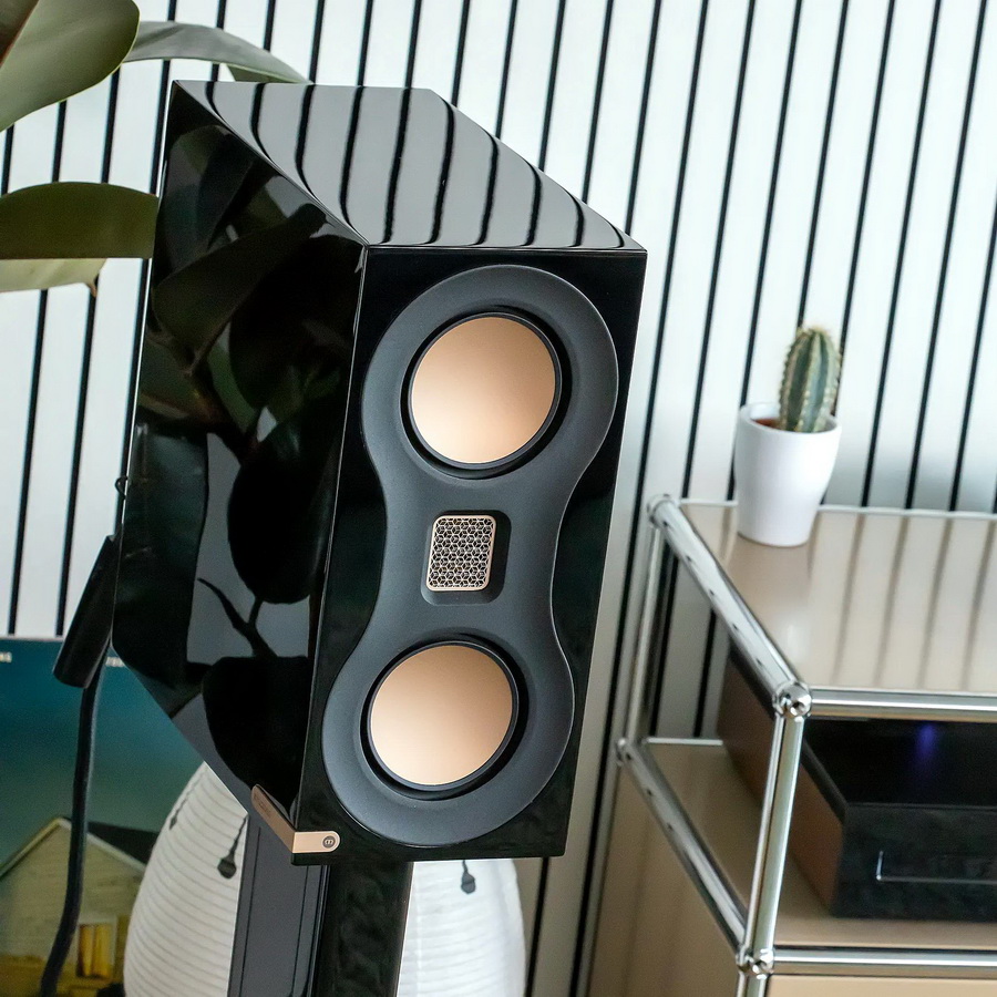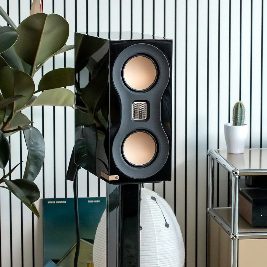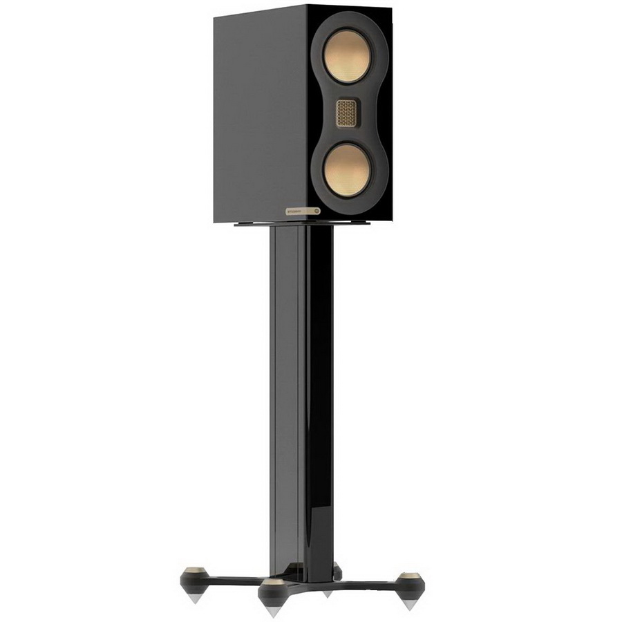 Monitor Audio Studio 89 – компактные колонки с нетипичными габаритами: их глубина превышает высоту. Опциональные стойки предусматривают надёжное крепление колонок к площадкам. В сборе они выглядят очень гармонично. Чёрная лаковая отделка отлично дополняется золотистой металлической фурнитурой. Излучатели Monitor Audio Studio 89 расположены по схеме D’Appolito в конфигурации MTM (Mid-Tweeter-Mid). Массив драйверов работает как точечный источник, обеспечивая более сфокусированное звукоизвлечение. Высокие частоты обрабатываются излучателем Хейла, или MPD (третьего поколения), согласно фирменной терминологии Monitor Audio. Твитер защищен решеткой из позолоченной металлической сетки.