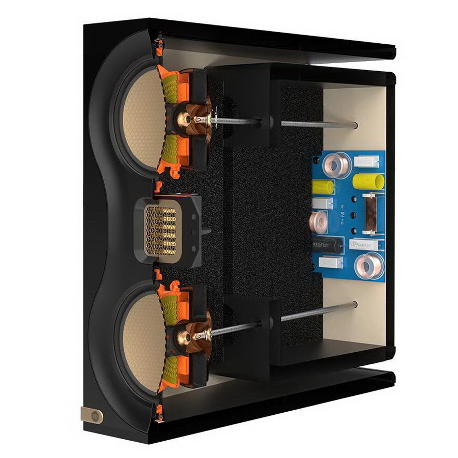 Два мощных динамика 4¼” обеспечивают пробивной, артикулированный и контролируемый бас, который идеально сочетается с высокими частотами твитера. Вместе эти излучатели зафиксированы на алюминиевой раме, акустически развязанной от основного корпуса. Дополнительную поддержку низких частот обеспечивают два высокоскоростных щелевых фазоинверторных порта HiVe II на задней панели Monitor Audio Studio 89. Номинальная мощность колонок составляет весомые 150 Вт, а звуковое давление достигает 113 дБ. В разделительном фильтре используются аудиофильские комплектующие, включая катушки индуктивности с воздушным сердечником и полипропиленовые конденсаторы.