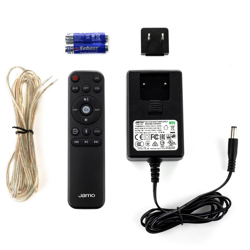 Jamo S 801 PM доступны в двух вариантах отделки матовым виниловым покрытием — черном и белом — с древесной поверхностью обрамления твитера и основания корпуса. Тканые грили на каркасах крепятся невидимыми магнитами. В комплекте — пульт ДУ с батарейками и кабель USB.