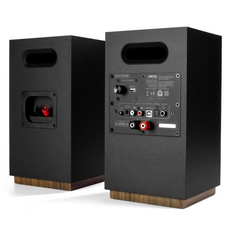 Из выходов, кроме вполне серьезных акустических терминалов для подключения пассивной колонки, присутствует RCA-разъем для подачи сигнала на активный сабвуфер. Кроме того, S 801 PM может принимать потоковую передачу по Bluetooth. Активную колонку из комплекта Jamo Studio S 801 PM отличает наличие круглого окна ИК-приемника пульта ДУ на передней панели. В системах установлены 1-дюймовые твитеры с мягким куполом, дополненные технологией WaveGuide для улучшения динамики и качества звука. Драйверы СЧ/НЧ получили алюминированные диффузоры из полифибры. Постоянная мощность систем — до 24 Вт в канале.