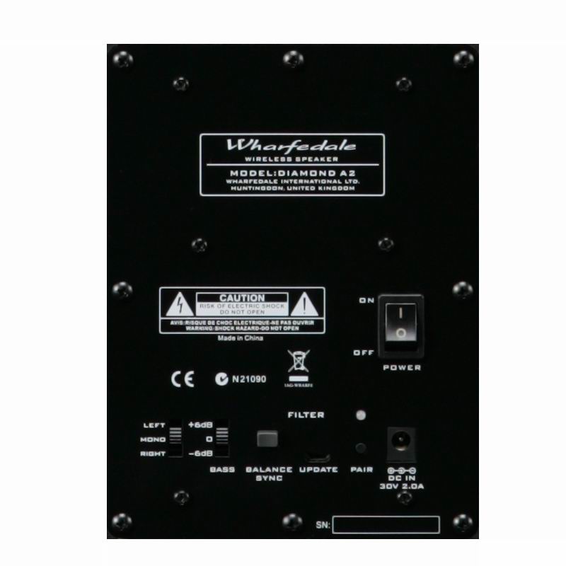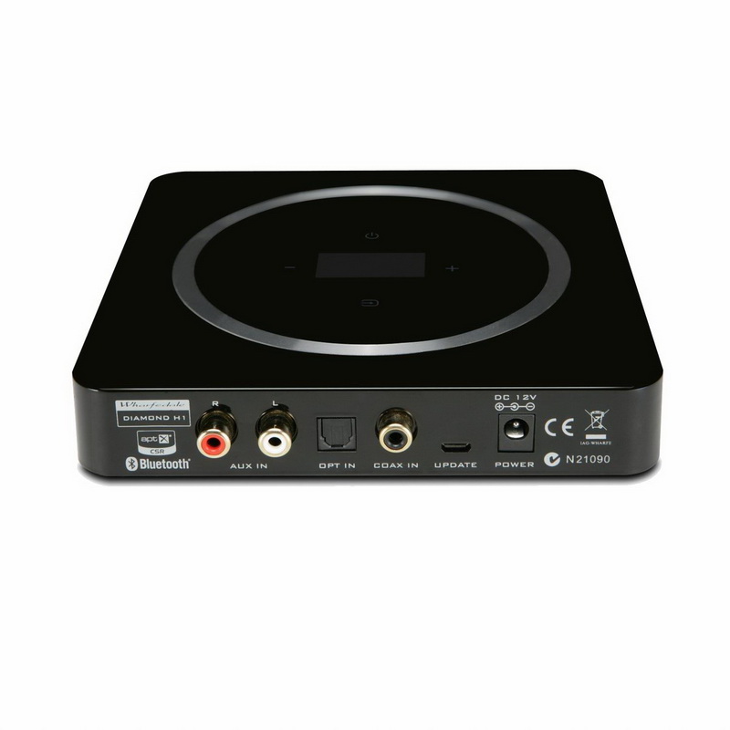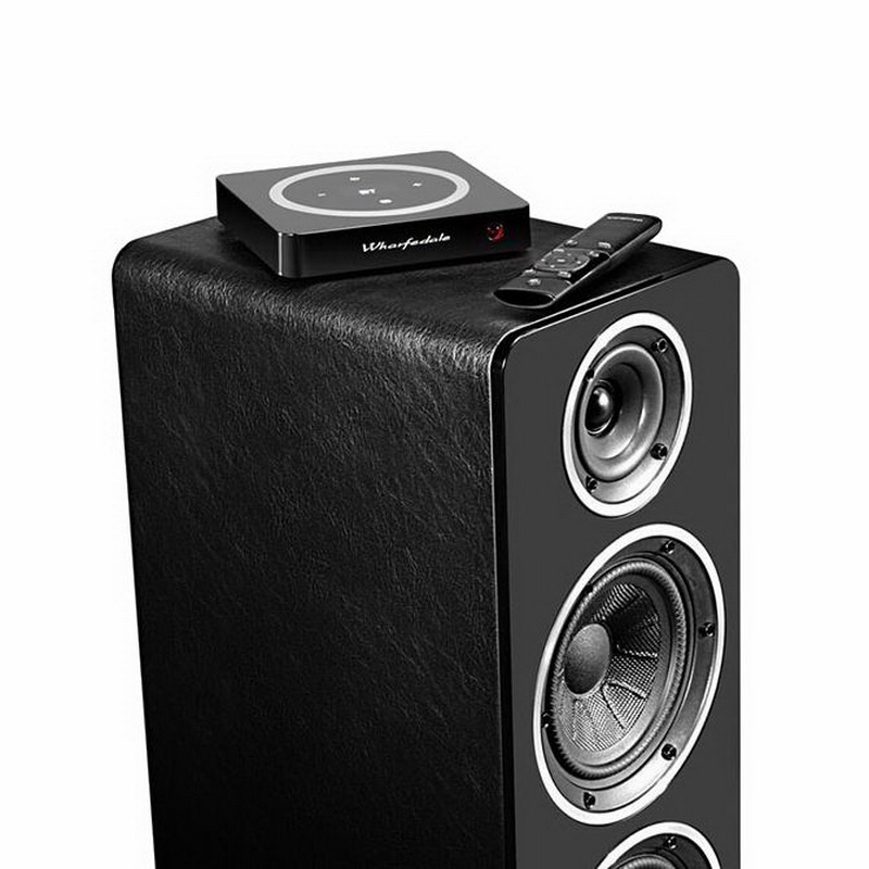 В каждую колонку Wharfedale Diamond Active А2 встроен усилитель мощностью 100 Вт, а сигнал от источника поступает по беспроводному каналу. Но модуль Bluetooth aptX не встроен в сами колонки и являет собой отдельный небольшой блок-контроллер Wharfedale H1: именно он подключается к источнику, а далее транслирует сигнал на колонки по радиоканалу 5,8 ГГц. Такая конструкция позволяет избавиться от силовых и сигнальных кабелей между колонками и разнести их на расстояние до 20 м от блока. Блок имеет клавиши управления громкостью и выбором источника, так что может частично заменить комплектный пульт ДУ. Из проводных подключений поддерживаются оптический и коаксиальный S/PDIF и два RCA.