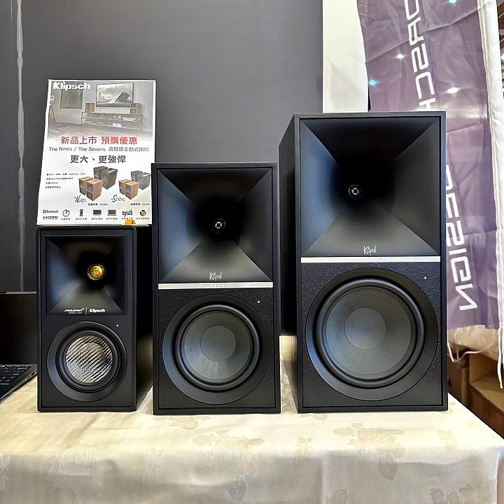 Пара Klipsch The Nines, представляющая собой связку активной (активный монитор) и пассивной (пассивный монитор) полочных акустических систем, позиционируется компанией Klipsch как альтернативный вариант современным саундбарам. АС выполнены в аккуратном дизайне с ретро-элементами и оснащены съемными грилями с магнитным креплением. Klipsch The Nines обладают дюймовым компрессионным твитером LTS с технологией линейного перемещения мембраны и титановым куполом. Твитер помещен в фирменный рупор Tractrix, гарантирующий точную диаграмму направленности и детальное звучание. Передачей СЧ/НЧ-диапазона занимается 8-дюймовый динамик с длинноходным диффузором из волоконного композита.