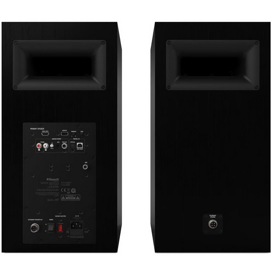 С виду это типичные колонки Klipsch с твитером в квадратном рупоре и солидным 8-дюймовым басовиком в корпусе довольно скромного объёма. Для левой колонки это описание подходит вполне, а вот с той, что у нас стоит справа, всё не так просто. Эта пара построена по распространённому принципу «ведущая — ведомая», т.е. активная колонка лишь одна, а вторая подключается к ней 3,5-метровым акустическим кабелем с резьбовыми байонетами, который входит в комплект. Впрочем, каналы можно поменять местами одним щелчком переключателя, если к электрической розетке будет удобнее подключать левую колонку.