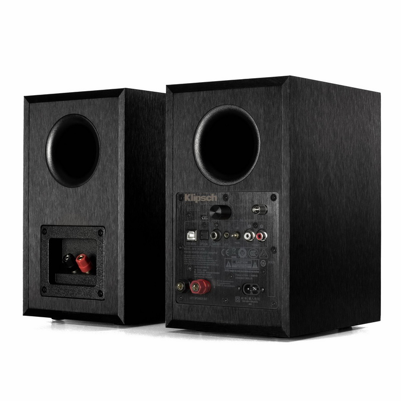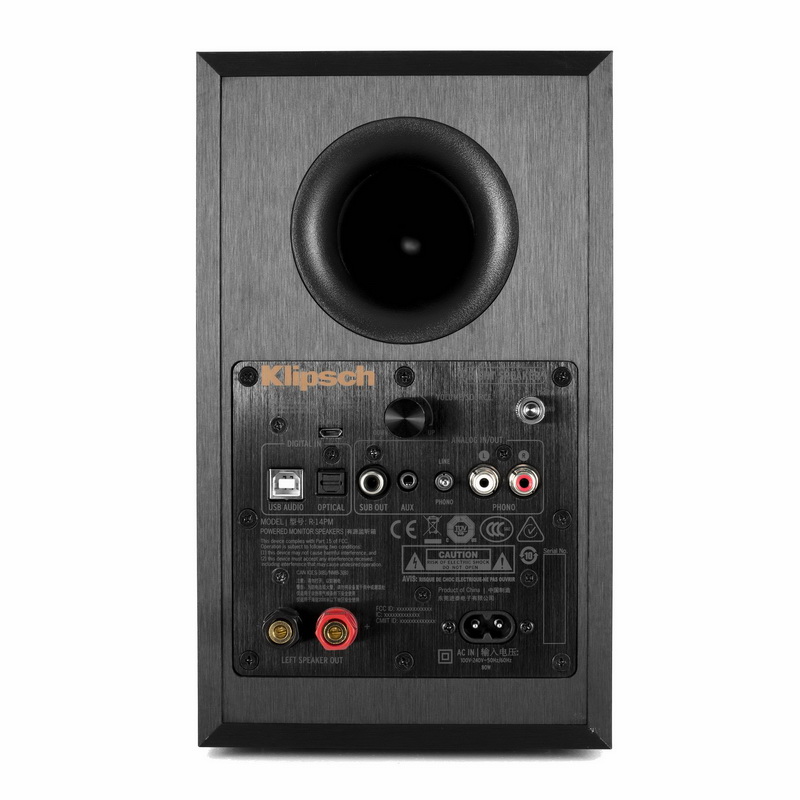 Тыльная панель ведущей АС занята пластиной с коммутацией и регулятором громкости. Расположенные там два разъема RCA можно задействовать как в качестве стандартного линейного входа, так и в роли Phono-разъемов для винилового проигрывателя. Для выбора требуемой функции рядом установлен переключатель-селектор. Имеется входной мини-джек Aux, USB-порт для работы с компьютером, оптический вход и RCA-сокет для сабвуфера, благодаря которому можно усилить басовый потенциал системы. Для подключения ведомого спикера (левая АС) служат две винтовые клеммы (в комплекте имеется специально предназначенный для этого акустический кабель). Для управления Klipsch R-14PM предусмотрен штатный пульт. На фасаде правого спикера имеется встроенный индикатор, который сигнализирует определенным цветом при выборе соответствующего этому цвету источника.