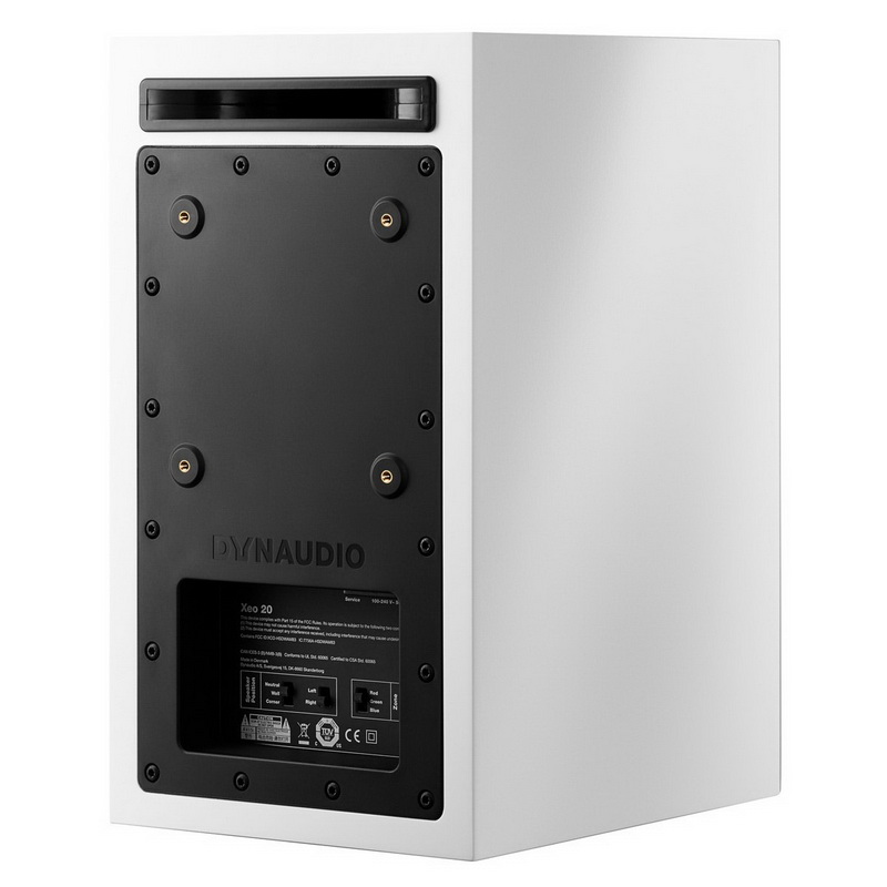 Dynaudio Xeo 20 можно установить на опционные подставки Stand 10 или Stand 20, кроме того, на задней панели имеются места для крепления кронштейна Vesa 100. Она выпускается в двух вариантах отделки: Black Satin (матовая черная) и White Satin (матовая белая).