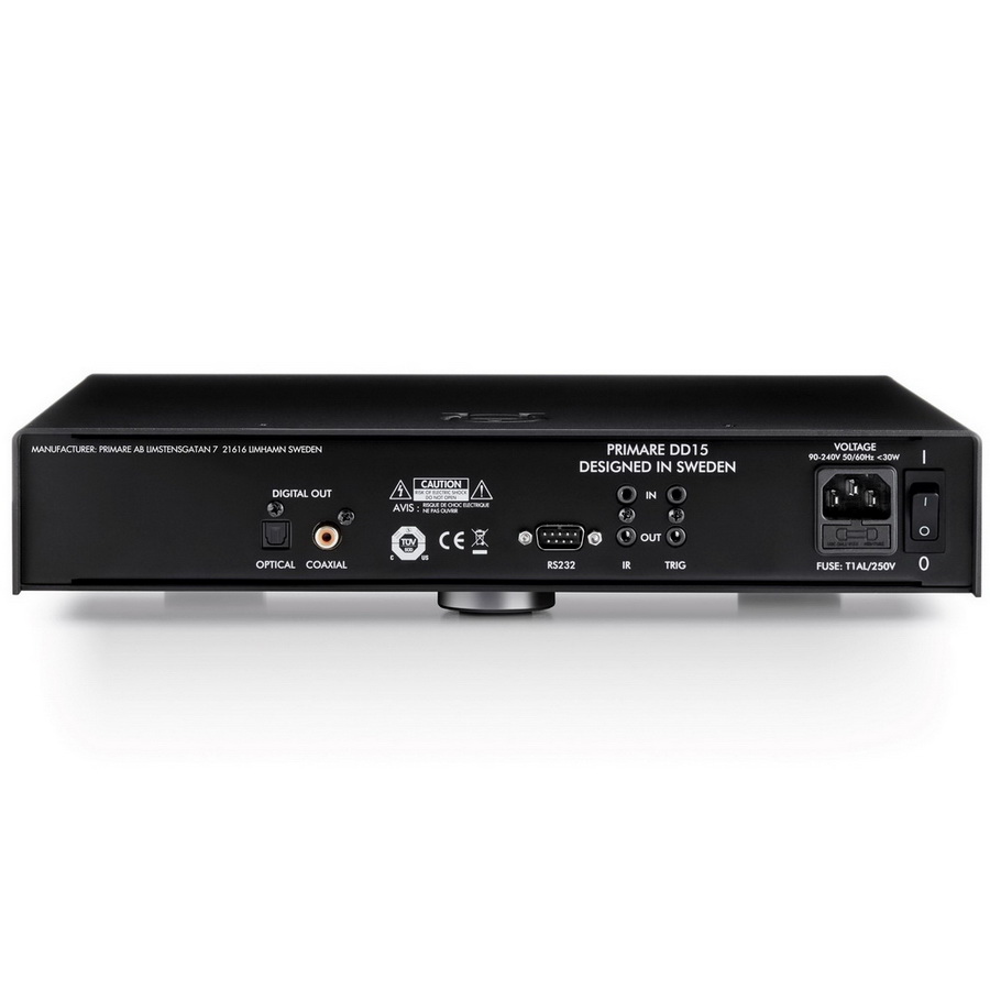 Primare DD15 является хорошим решением, если ваша аудиосистема уже оборудована ЦАП, ведь в таком случае приобретение CD-плеера с собственным ЦАП не целесообразна. Primare DD15 оснащен цифровыми выходами Toslink и коаксиальным S/PDIF (RCA). Управление через порты RS232, 3,5 мм ИК (I/O) и 2х3,5 мм порта Триггера (I/O). В комплект входит пульт дистанционного управления C25 RC IR.