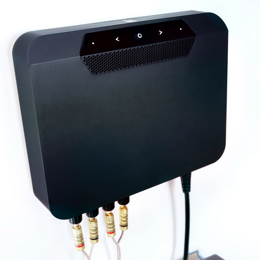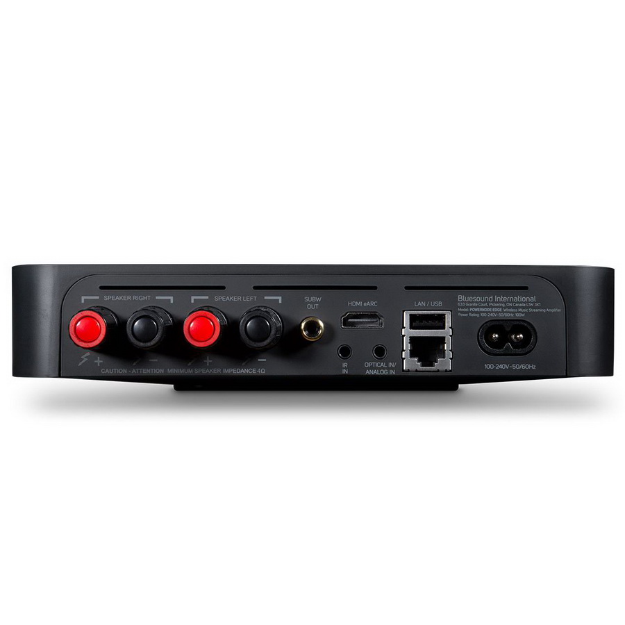 В верхнюю часть компактного корпуса BlueSound PowerNode Edge N230 интегрирована сенсорная панель управления. На задней стенке имеется 3,5 мм комбо-разъем, сочетающий в себе линейный AUX и оптический вход. Там же находится RCA-порт для сабвуфера, USB для внешних накопителей, LAN-порт для интеграции в локальную сеть и актуальный разъем HDMI с поддержкой расширенного возвратного канала eARC, позволяющий подключить проигрыватель к ТВ.