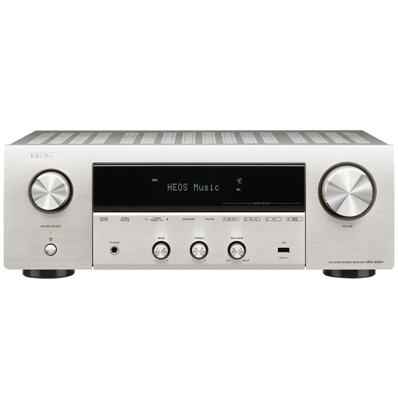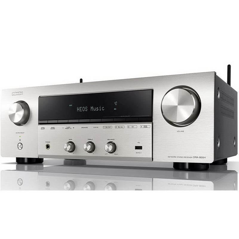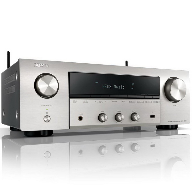 Denon DRA-800H поддерживает Wi-Fi с двумя диапазонами для более надежного соединения, AirPlay и Bluetooth. При проводном подключении через LAN-порт по локальной сети доступно воспроизведение таких хранящихся в компьютерах и серверах этой сети Hi-Res-форматов, как PCM до 24 бит/192 кГц и DSD до 5,6 МГц (в режиме PCM-конверсии). Имеется встроенный FM-тюнер с RDS, поддерживается цифровое радио, веб-радио и различные Интернет-сервисы, включая Spotify Connect, TIDAL, TuneIn и Deezer.