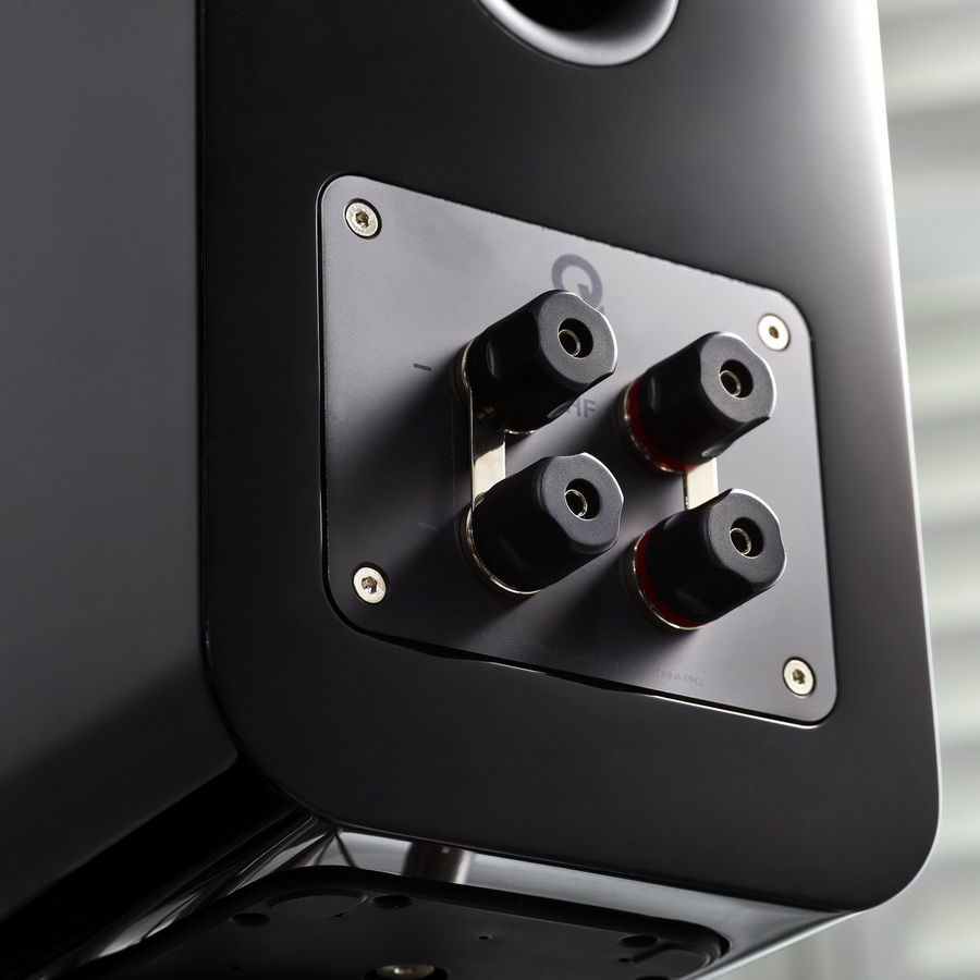 Эта технология названа компанией Gelcore. Колонки выполнены по 2-полосной схеме. Твитер изолирован от передней панели специальным мягким демпфирующим кольцом. Купол твитера диаметром 25 мм изготовлен из ткани, а звуковая катушка охлаждается с помощью магнитной жидкости. В качестве СЧ/НЧ-излучателя используется новый динамик диаметром 125 мм. Материал диффузора с виду похож на полимер. Динамик работает на фазоинвертор, порт которого вынесен на тыльную сторону корпуса колонки. Там же располагаются две пары больших винтовых клемм. Стильная подставка также выполнена с использованием антирезонансной прослойки. Она не только приятно смотрится, но и обеспечивает хорошую устойчивость благодаря прозрачному «крылу» с шипами на концах.