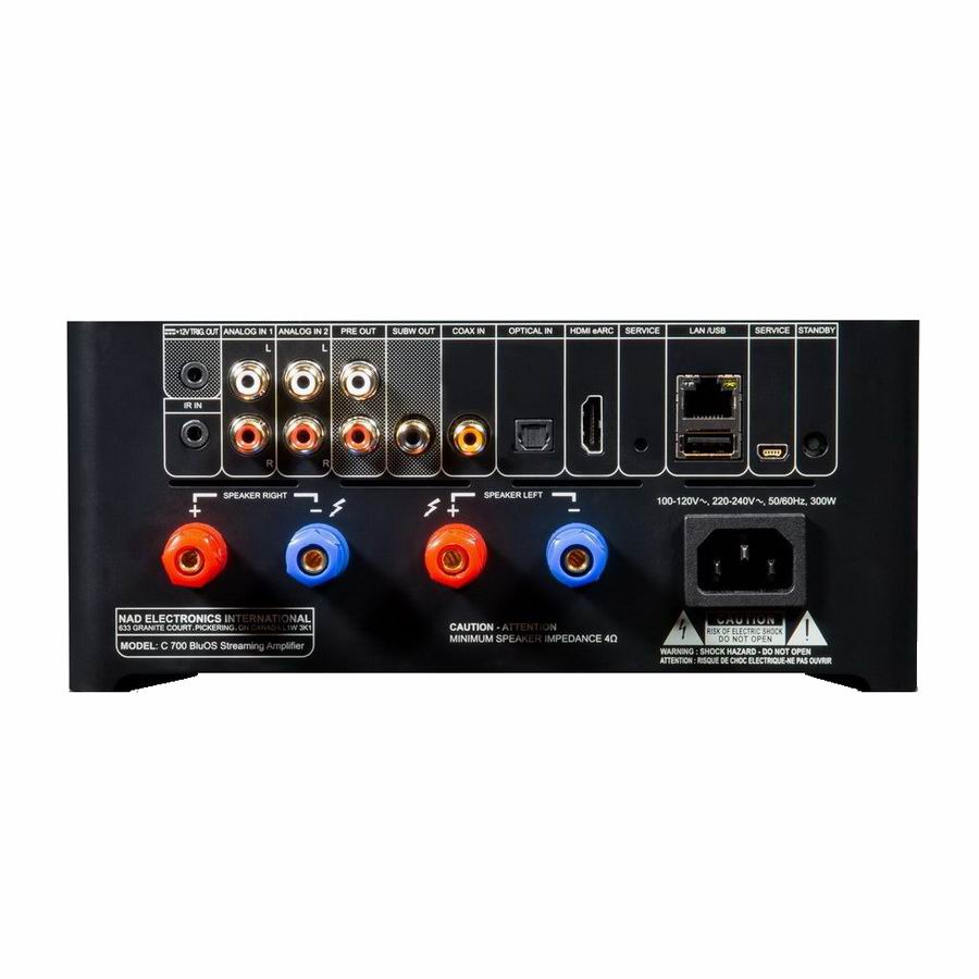 Компактный усилитель NAD C 700 имеет хороший набор входов для подключения исходных компонентов, таких как проигрыватель дисков, игровая консоль и HDTV. Но выдающейся особенностью является сетевой музыкальный стример на базе BluOS. Разработанный материнской компанией NAD Lenbrook Industries для линейки потоковых продуктов Bluesound для нескольких комнат, BluOS используется во все большем числе компонентов NAD, а также в продуктах лицензиатов, таких как DALI, Monitor Audio и Roksan.