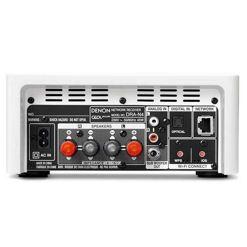 Denon DRA-N4 поддерживает подключение к домашней компьютерной сети (как с помощью кабеля Ethernet, так и через Wi-Fi), и может воспроизводить аудиофайлы всех популярных форматов. Кроме сжатых MP3 и WMA, ресивер читает и lossless FLAC, WAV, ALAC и AIFF, с параметрами до 24 бит / 192 кГц, при этом поддерживается воспроизведение альбомов без пауз между треками. Также имеется возможность приема интернет-радио и пользования различными сетевыми музыкальными сервисами. Устройства Apple можно подсоединить к Denon DRA-N4 напрямую, используя беcпроводную технологию AirPlay, или USB-вход на его передней панели. К этому же разъему можно подключить портативные накопители с музыкальными файлами. Остальная коммутация ресивера включает приемник Bluetooth с поддержкой NFC, аналоговый и цифровой оптический входы, а также выходы для подключения активного сабвуфера и наушников.