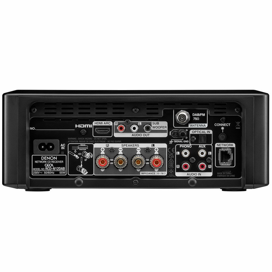 Denon RCD N12DAB оснащен большим количеством встроенных источников сигнала. Здесь имеются CD-плеер с быстрой загрузкой диска и практически бесшумно работающим механизмом, а также очень качественный FM/AM тюнер. Однако это является лишь частью списка возможностей данной модели, большинство из которых связаны с сетевым функционалом Denon RCD N12DAB. Здесь предусмотрено воспроизведение музыкальных файлов как с различных устройств (подключение к сети по Ethernet или Wi-Fi), а также пользование различными online-сервисами. Denon RCD N12DAB можно включить в беспроводную фирменную систему мультирум HEOS, а также соединять напрямую с устройствами, поддерживающими технологию AirPlay/AirPlay 2. Вход HDMI поддерживает возвратный аудиоканал ARC, что удобно при подключении к телевизору. На борту имеется MM-фонокорректор. Также в системе предусмотрен Bluetooth и имеется USB-вход для подключения портативных накопителей.