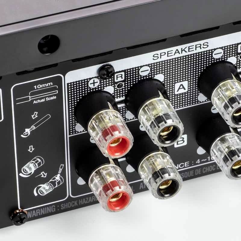 Наконец, Marantz Melody X (M-CR612) понимает и выполняет голосовые команды посредством соответствующих помощников: Amazon Alexa, Google Assistant, Apple Siri. Как уже говорилось, Marantz Melody X (M-CR612) обеспечивает три варианта подключения колонок. Для этого предназначены четыре пары разъемов на задней панели, а используя меню на дисплее и кнопку Speaker A/B на пульте, можно установить необходимый режим работы встроенного усилителя.