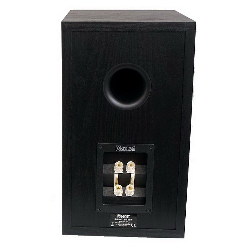 Magnat Signature 503 оформлены в солидных корпусах размером 205 x 365 x 282 мм; весит одна колонка 6,1 кг. Передняя панель имеет специальную конструкцию, призванную улучшить дисперсию и уменьшить резонансы. Так, оформление ВЧ-блока сделано специальным гасящим звуковые волны материалом. Для сборки кабинетов использованы плиты из жесткого E1-MDF, порты Airflex, смонтированные в верхней части задних стенок корпусов, рассчитаны на минимизацию вихревых потоков. Дополнительной развязкой от поверхности установки служат встроенные резиновые опоры – но, конечно же, данные АС лучше размещать на специальных стойках и развязать от них шипами. Грили съемные, терминалы для подключения (Bi-Wiring/Bi-Amping) – очень качественные крупногабаритные с золотым покрытием. Модель может поставляться как в черной версии с лакированной передней панелью, так и в отделке «mocca» с матовым фасадом.