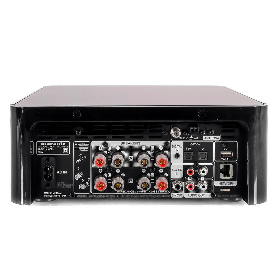 В центре передней панели находится крупный люминесцентный дисплей, на который выводится вся необходимая информация о работе системы. Управление Marantz M-CR612 простое и интуитивно понятное, доступное как с пульта ДУ, так и через фирменное приложение.