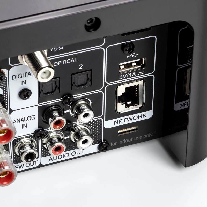 На задней панели находится USB-порт (тип A) для жестких дисков или флэшек. Вставлять их неудобно, но понять разработчиков тоже можно: зачем портить элегантную симметрию передней панели еще одним входом, если его роль, как и CD-привода, неуклонно снижается. Сейчас персональная музыка все чаще хранится в смартфонах, а воспроизводить ее возможно без проводов с помощью технологий Bluetooth и AirPlay 2, которыми оснащен ресивер.