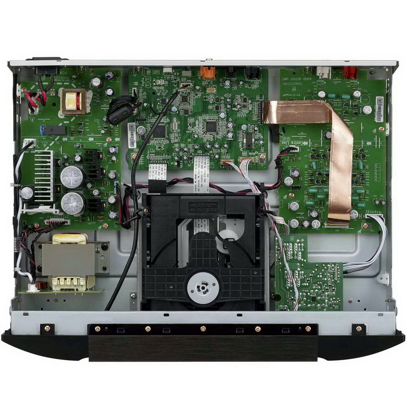 Внутреннее строение аппарата традиционно – по центру расположен радиатор, делящий объем на две части. В одной из них находится солидный тороидальный трансформатор, надежно экранированный металлическим кожухом, в другой – все аналоговые и цифровые цепи, включая процессор и ЦАП. В каскаде предварительного усилителя установлены фирменные сборки на дискретных элементах HDAM (Hyper-Dynamic Amplifier Module) версии SA3, выходные каскады реализованы с применением обратной связи по току, что потенциально обещает хороший контроль акустических систем. Заявленная мощность – 60 Ватт при нагрузке 8 Ом, весит аппарат 10,3 килограмма.
