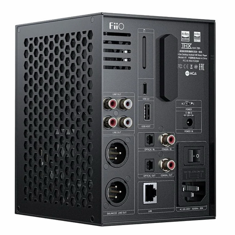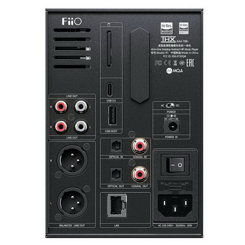 Цифровая часть выполнена на базе процессора Snapdragon 660 и ЦАП ES9068AS. Фирменная программная оболочка обеспечивает очень удобный доступ к многочисленным функциям аппарата. Для воспроизведения контента в форматах Lossless и High resolution можно использовать Ethernet или Wi-Fi-подключения к домашней сети. Два USB-порта работают в режиме Host, в том числе и для подключения ЦАП, внешних устройств или накопителей. В плеере имеется слот для SD-карт объемом до 2 ТБ. Внешние источники сигнала подключаются через оптический и коаксиальный входы. Сигнал на усилитель можно снимать с небалансных или балансных выходов, а для внешнего ЦАП есть оптический и коаксиальный выходы. Кроме того, FiiO R7 оснащен высококлассным усилителем для наушников на базе двух микросхем THX AAA 788. Предусмотрены выходы для небалансных и балансных моделей. С помощью переключателя на передней панели сигнал перенаправляется на наушники или внешнюю систему.