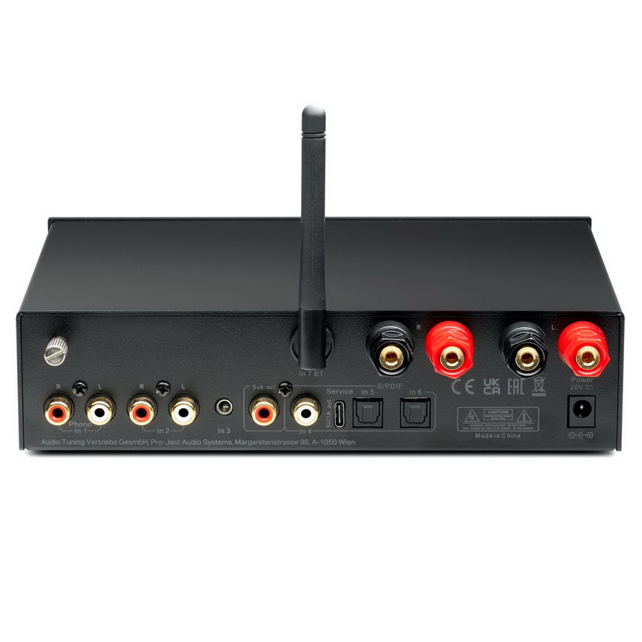 Усилитель Stereo Box E оборудован выходами на акустику (винтовые клеммы, совместимые с 4-мм штекерами «банан») и на наушники (гнездо 6,3 мм). Регулируемый RCA выход позволяет подключить сабвуфер или другой усилитель мощности. В комплект пульт входит пульт ДУ.