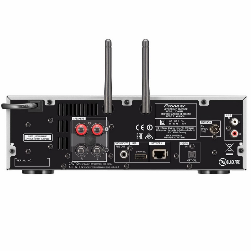Модель Pioneer X-HM76 оформлена строго и лаконично. В комплекте присутствует пара двухполосных акустических систем классического дизайна и ресивер с приводом компакт-дисков, тюнером и современным сетевым проигрывателем. Как у дорогих музыкальных серверов, лицевую панель центрального блока украшает цветной ЖК-экран с диагональю 3,5 дюйма. Большая часть органов управления смешена на верхнюю грань корпуса, спереди остался только барабанный регулятор громкости. В комплекте предусмотрен элегантный полноразмерный пульт ДУ. Конечно, доступ ко всем возможностям проще и нагляднее открывается из фирменного приложения для мобильных гаджетов, но для каких-то базовых задач классический вариант управления системой остается вполне удобным. Специалисты Pioneer довели до технического совершенства усилители класса D, которые по степени музыкальности уже перегнали привычный в микросистемах класс АВ, а по энергоэффективности были на первом месте изначально. В данной модели выходные каскады развивают мощность 50Вт на канал при нагрузке в 4 Ом, что соответствует номинальному сопротивлению комплектной акустики.