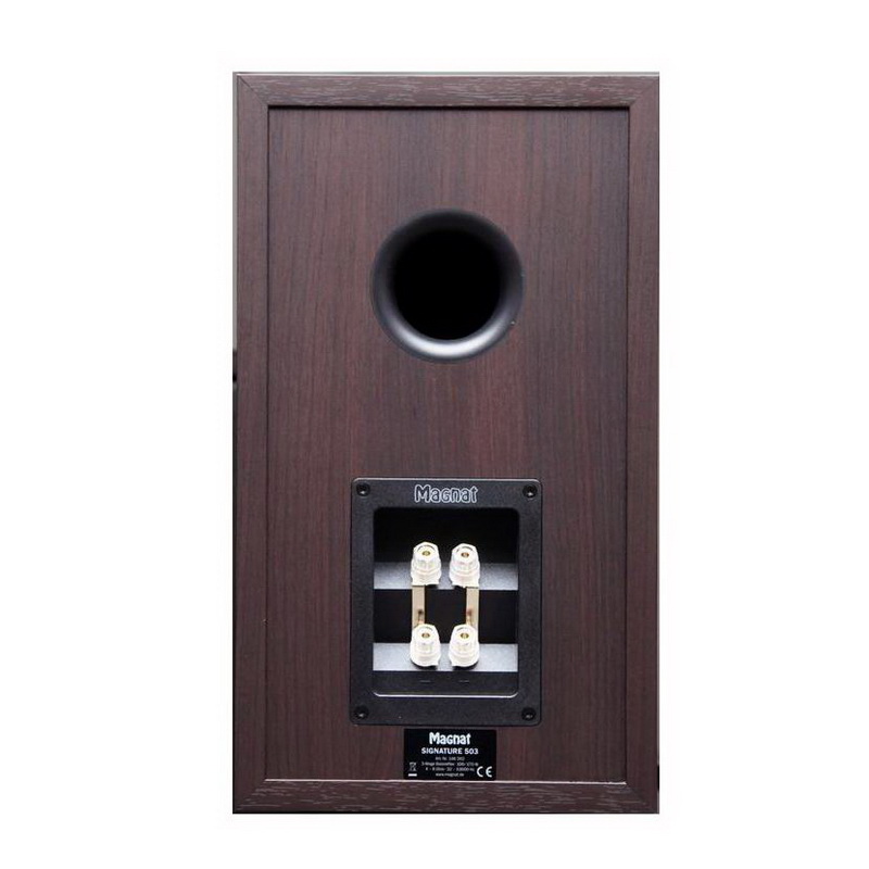 Magnat Signature 503 оформлены в солидных корпусах размером 205 x 365 x 282 мм; весит одна колонка 6,1 кг. Передняя панель имеет специальную конструкцию, призванную улучшить дисперсию и уменьшить резонансы. Так, оформление ВЧ-блока сделано специальным гасящим звуковые волны материалом. Для сборки кабинетов использованы плиты из жесткого E1-MDF, порты Airflex, смонтированные в верхней части задних стенок корпусов, рассчитаны на минимизацию вихревых потоков. Дополнительной развязкой от поверхности установки служат встроенные резиновые опоры – но, конечно же, данные АС лучше размещать на специальных стойках и развязать от них шипами. Грили съемные, терминалы для подключения (Bi-Wiring/Bi-Amping) – очень качественные крупногабаритные с золотым покрытием. Модель может поставляться как в черной версии с лакированной передней панелью, так и в отделке «mocca» с матовым фасадом.