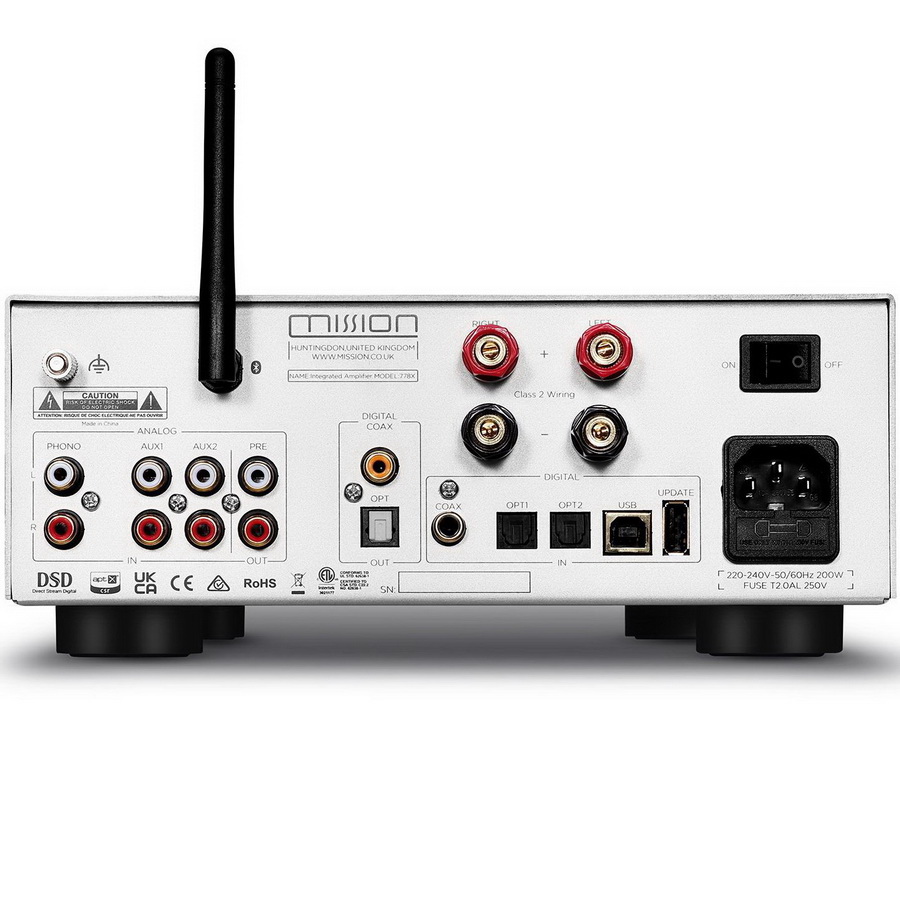 Цифровые источники, подключенные через USB, коаксиальный и оптический входы или сопряженные для приема по Bluetooth, в полной мере используют встроенный в Mission 778X ЦАП высокого разрешения. Он основан на чипсете ES9018K2M из референсного семейства Sabre32, что позволяет усилителю использовать все преимущества 32-разрядной архитектуры ESS и технологии HyperStream с целью устранения джиттера во временной области - для обеспечения превосходного динамического диапазона и сверхнизких искажений. Поддерживается формат PCM высокого разрешения - до 32 бит/384 кГц, а также поток DSD до 11,2 МГц (DSD256).