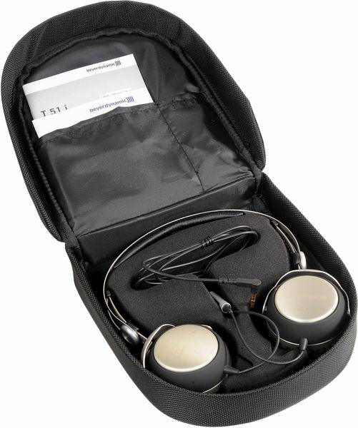 Наушники Beyerdynamic T51i имеют прямой двухсторонний несъемный шнур со специальной отделкой для снижения «микрофонного эффекта». Разделка выполнена с помощью 3,5 мм штекера. В набор входит переходник под 6,3 мм разъем и самолетный адаптер (2 х 3,5 мм). Благодаря поворотной конструкции чашек модель не занимает много места. В комплекте имеется прочный нейлоновый кейс для транспортировки.