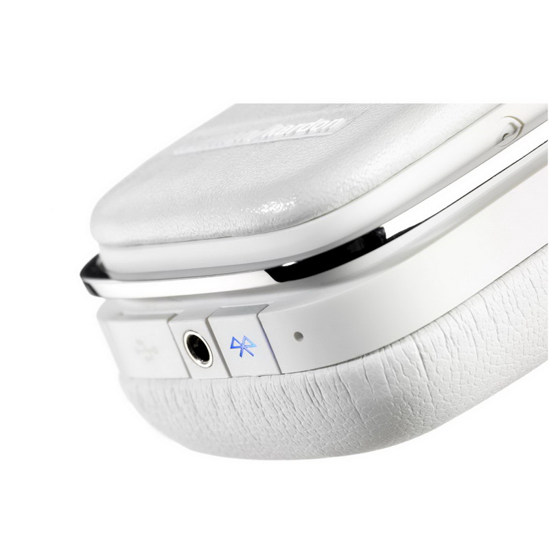 На нижнем торце правой чашки расположились закрытый слот разъема microUSB (для зарядки аккумулятора), 3,5-мм аудио-коннектор, кнопка для связывания по Bluetooth со встроенным цветным индикатором (красный/синий), а также отверстие для "разговорного" микрофона (наушники могут использоваться, как гарнитура).