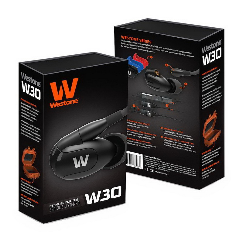 Westone W30 – арматурные наушники серии W, новое поколение легендарных Westone 4R. W30 – это арматурные наушники с тремя драйверами на канал, раздельно передающими низкие, средние и высокие частоты. Такая конструкция обеспечивает звук профессионального уровня с потрясающей детализацией и натуралистичностью звукопередачи. А фирменная технология True-Fit гарантирует отличную эргономику и высокий комфорт эксплуатации. Westone W30 используют конструкцию со съёмным шнуром; в комплекте идут два шнура: плетёный (для прослушивания музыки) и прямой с пультом управления и микрофоном (для использования наушников в качестве гарнитуры).