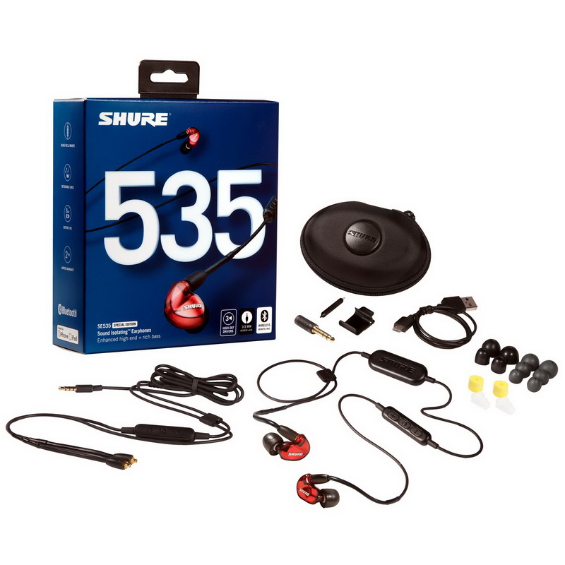 Тройные арматурные драйверы обеспечивают масштабный звук и богатый бас для качественного аудио в портативном виде. Съёмные кабели дают различные варианты подключений и длительный срок службы наушников. Звукоизолирующая конструкция блокирует до 37 дБ окружающего шума для иммерсивного прослушивания, где бы вы ни находились. Провода, принимающие форму ушей, плотно прилегают и обеспечивают комфортное использование Доступна ограниченная серия наушников с обновлённым акустическим дизайном, уникальной красно-серой гаммой и укороченным кабелем. В комплекте с прозрачной моделью SE535 идёт стандартный кабель с разъёмом 3.5 мм, чехол на молнии, адаптер ¼“ и набор втулок.