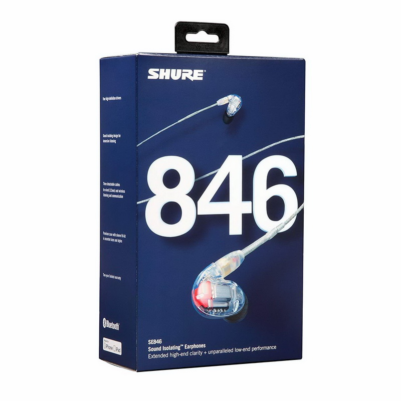 По заверению производителя, Shure SE846 способны изолировать до 37 дБ внешнего шума. Согласно исследованиям компании, при использовании различных насадок возможно достичь показателя и в 44 дБ, однако в данном случае показатели несколько принижаются. По сравнение с уровнем Bose в 26 дБ это довольно приличный показатель. Корпус наушников абсолютно прозрачен, съемные кабели двух видов уплотнены у основания (т.н. технология «Shure's Wireform Fit»).