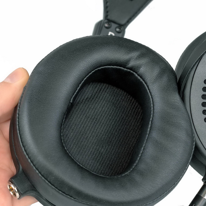 Кабель подключается довольно легко. Есть ли смысл в замене штатного кабеля для такой «бюджетной» модели, каждый решает сам. Амбушюры имеют огромные подушки. Для нас было несколько неожиданно то, что, несмотря на открытую конструкцию, в наушниках плохо слышны окружающие звуки, а уши потеют примерно так же, как в закрытых наушниках. Скорее всего, открытость тут в основном касается мембраны — обратная ее сторона не нагружена на замкнутый объем. Однако особенной вентиляции для ушей не ощущается.