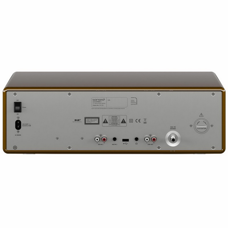 Корпус устройства выполнен в ретростиле и отделан шпоном актуальных цветов: чёрный лак, белый лак, красный лак или орех. Панели из стали завершают образ, делая его более современным. На передней части корпуса размещен удобный регулятор настроек, с которым управление Sonoro Stereo 2 будет простым и понятным. Большой и контрастный дисплей сделает работу с устройством еще более комфортной. На задней панели располагаются разъем для наушников и линейный вход для подключения портативных аудиоустроств. Стоит отметить функцию запоминания уровня громкости в наушниках независимо от уровня громкости самого устройства. При подключении наушников Sonoro Stereo установит последний выбранный пользователем уровень громкости сигнала.