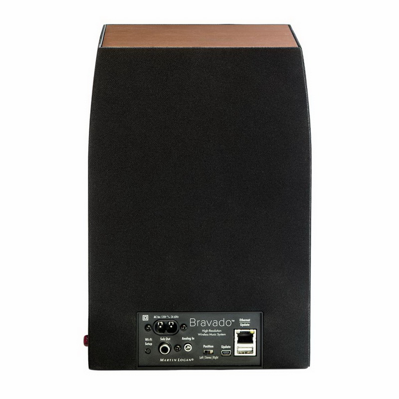 Пара симметрично направленных твитеров Folded Motion способна эмулировать стереобазу вполне ощутимых размеров, оставляя звучание алюминиевого вуфера на средних и низких частотах более чем убедительным. Его диффузор обладает отличным соотношением жесткости и массы, что позволяет передать звучание на достаточно большой мощности без значительных артефактов. Отметим, что суммарная мощность встроенных усилителей у этого «малыша» может достигать 200 ватт, то есть, Martin Logan Bravado с большим резервом озвучивает комнату средних размеров, да еще и с хорошо проработанным низкочастотным диапазоном. Это означает, что на малых и средних значениях громкости аппарат способен отработать все пиковые значения сигнала, создавая по-настоящему масштабное звучание.